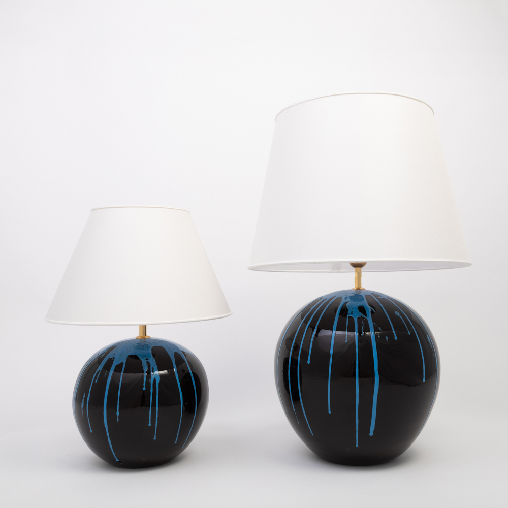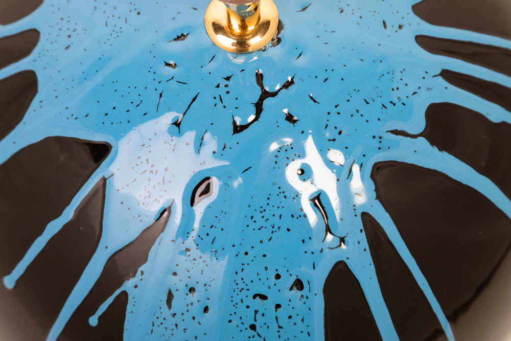 La forma sferica, di per sé molto semplice, e realizzata completamente a mano è arricchita da un decoro elegante e moderno. Data la tecnica di smaltatura, ogni creazione è un pezzo unico, mai uguale alle altre: la lampada viene infatti smaltata in nero lucido e, prima della cottura, su di essa viene colato dello smalto turchese (tecnica artistica “dripping”).
